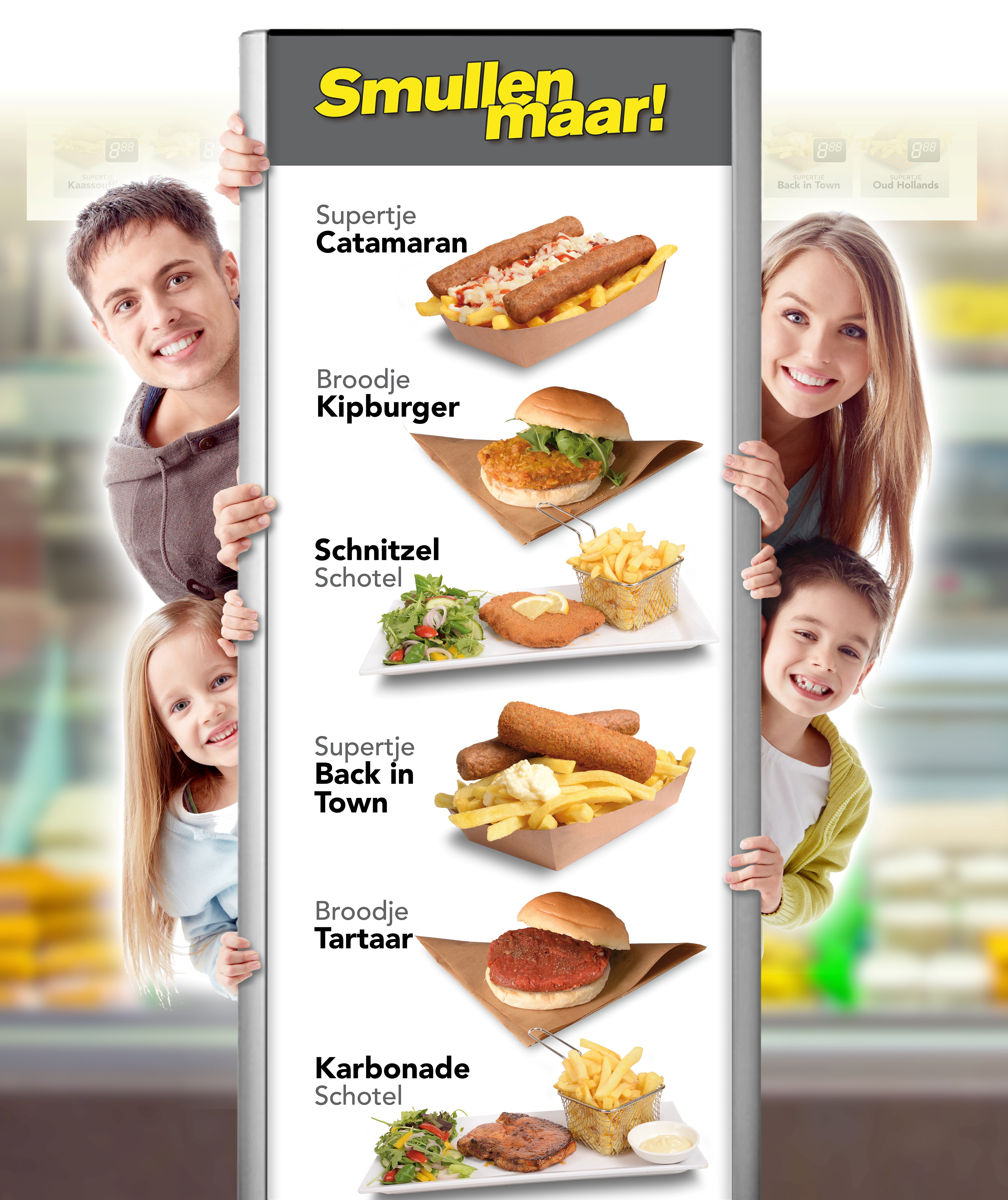 Uit een aanbod van honderden gerechten kun je samen met de verkoopadviseur van Horesca het promotiepakket samenstellen. Er is een grote databank met mooie beelden van al deze gerechten, waar jaarlijks nieuwe foto’s aan worden toegevoegd om het levendig te houden. Bovendien kun je zo gelijk inspiratie opdoen voor nieuwe gerechten op het menu. Wat dacht je van het presenteren van de saté (uiteraard zonder stokjes) op een bol met geroosterde uitjes, gehakte pinda’s, een paar stukjes kroepoek en een beetje atjar? Of een compleet nieuwe burger door enkel te experimenteren met een andere saus? Vanzelfsprekend zijn er ook voor vega-snacks en allergene vrije producten promotiemiddelen beschikbaar.